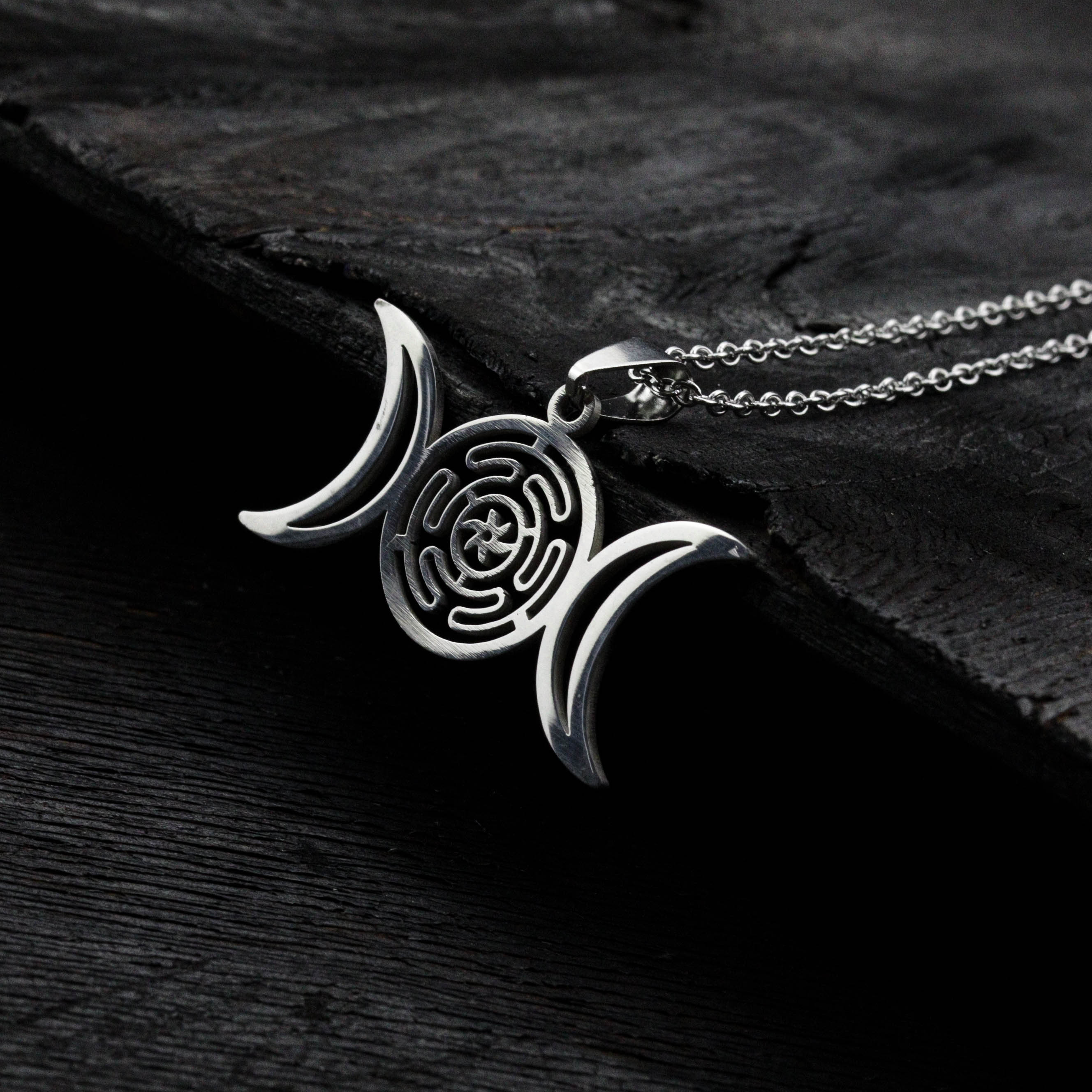 Este pingente exclusivo combina dois dos mais potentes símbolos do esoterismo: o Strophalos (a Roda de Hécate) centralizado no abraço da Triluna. Enquanto a Roda representa o caminho da alma e o labirinto do conhecimento, a Triluna evoca as três faces da Deusa: a Donzela, a Mãe e a Anciã.