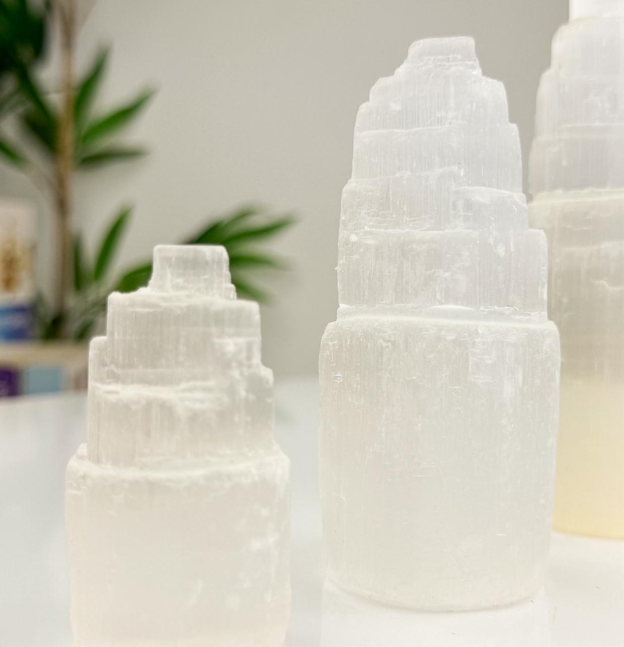 A Torre de Selenita é um cristal de alta vibração, conhecido por sua capacidade de purificar, alinhar e elevar a energia do ambiente. Seu formato em camadas lembra uma escada espiritual, simbolizando ascensão, clareza e conexão com planos superiores.